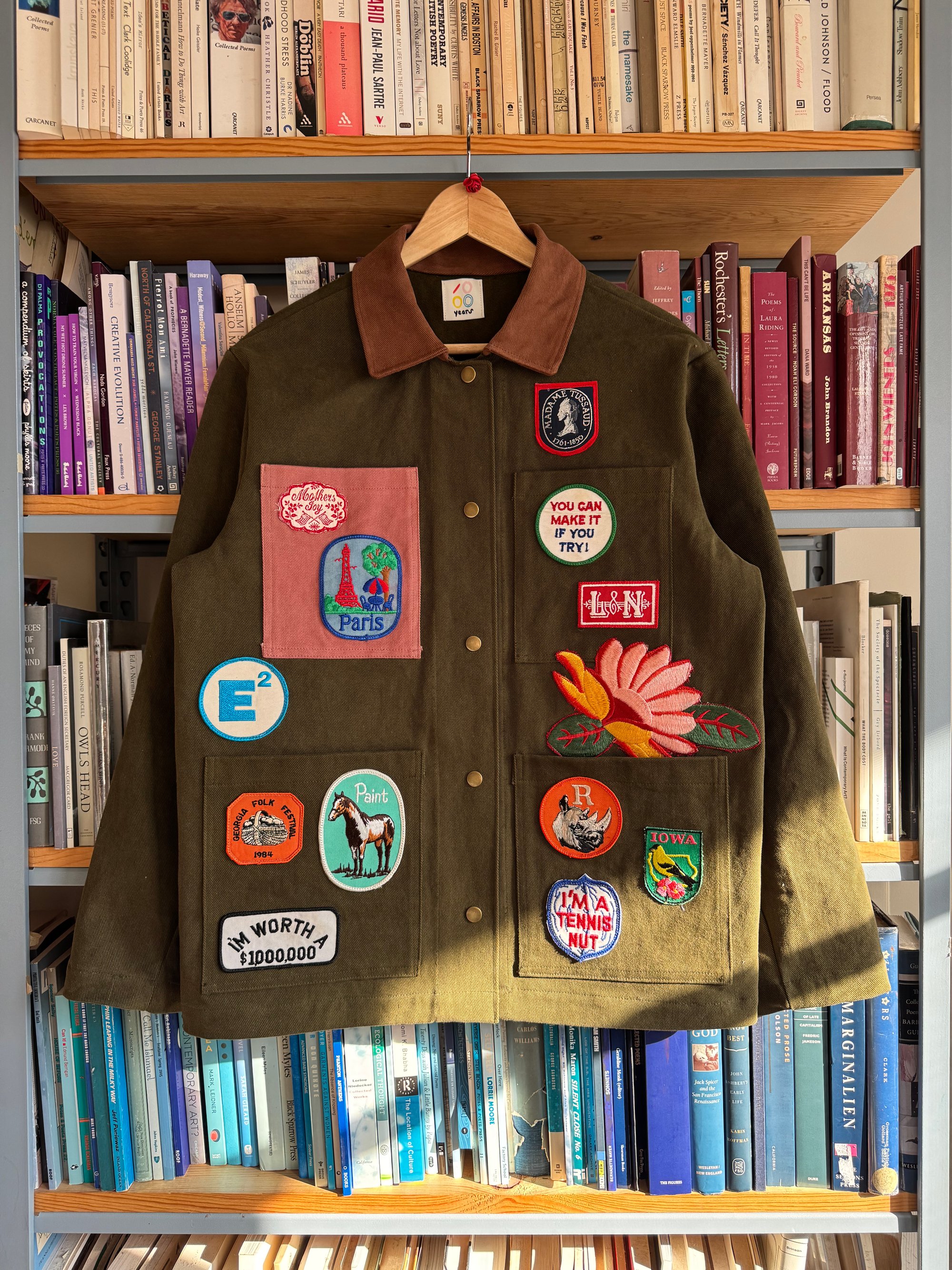 One-of-a-kind custom chore coat adorned with vintage patches. I will reach out to discuss fabrics, patches and fit.