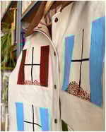 A soft, mid-weight denim chore coat with hand painted windows. Please note, this was the first sample and uses a boxier chore coat pattern. Perfect for layering! If you'd like a slimmer fit, please order the pre- order home coat.