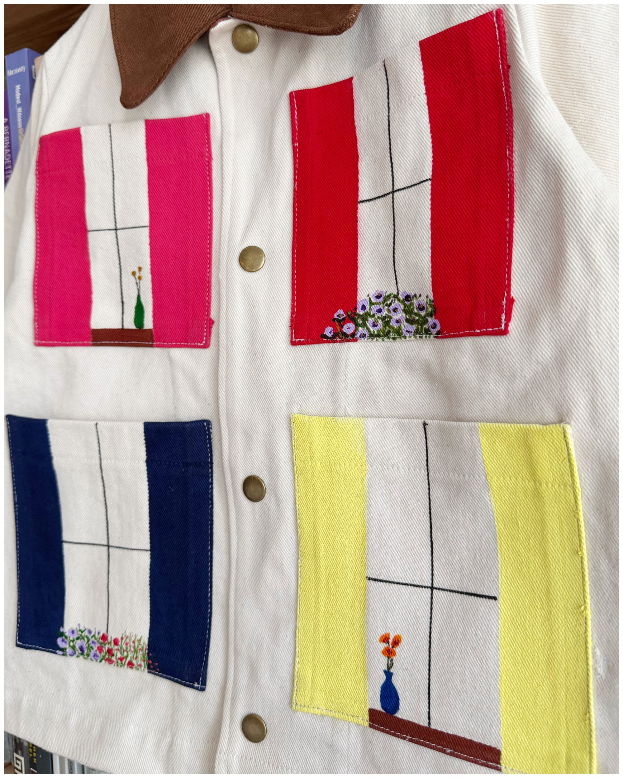 A soft, mid-weight denim chore coat with hand painted windows. There's extra room in the bust and sleeves for all your layering needs.
