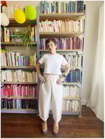 Mid-weight, soft, off-white denim pants with navy piped pockets and a vintage leopard patch on the tush.