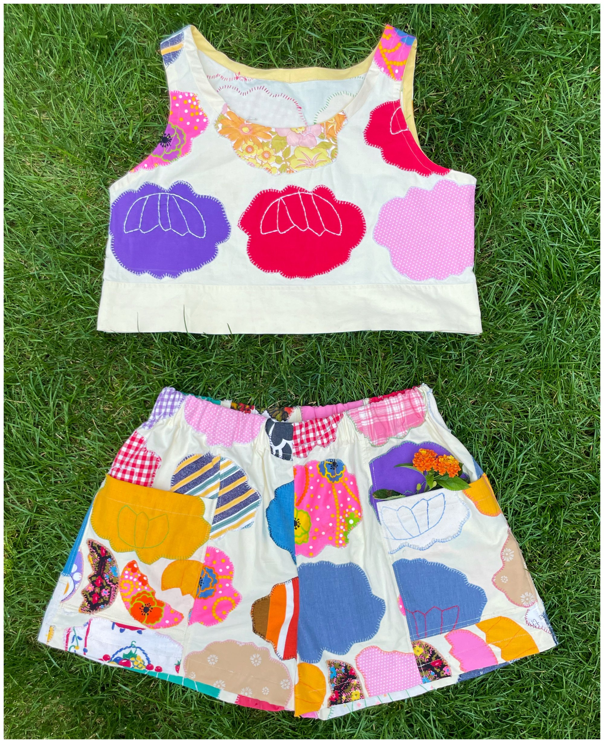 Keep it cool in this easy set. Sewn from a vintage appliqué quilt top. Light to medium weight, buttery soft. The price increase reflects the cost of the material.